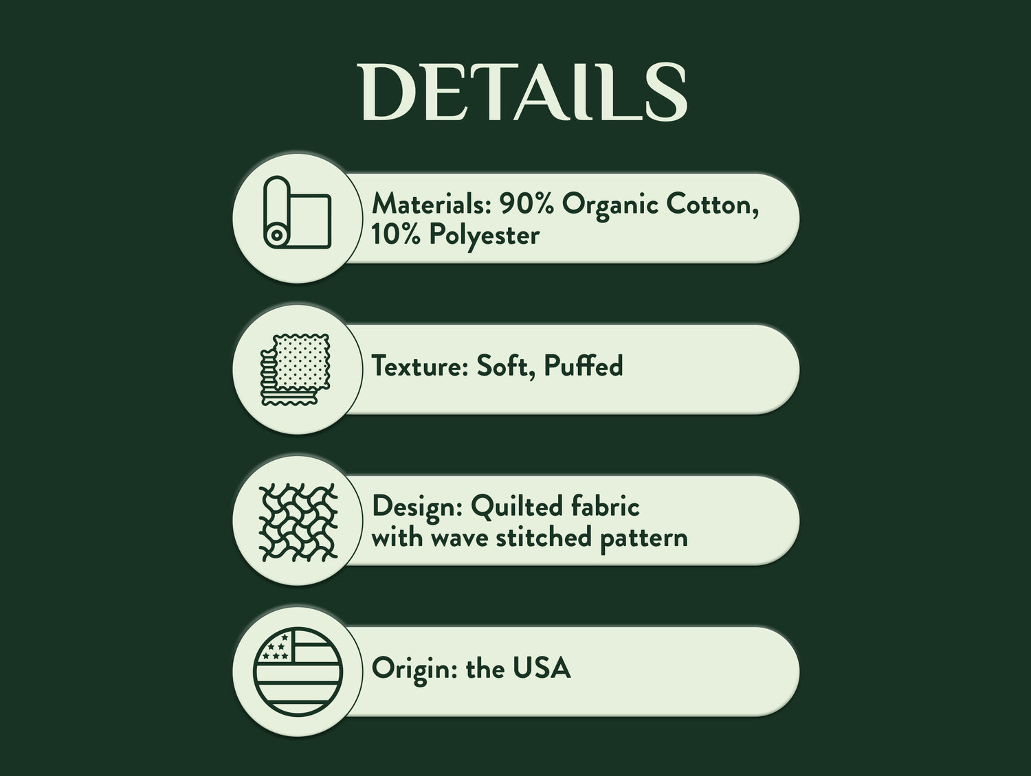 - Design: Unique, crafted with care and attention to detail, quilted fabric with wave stitched pattern